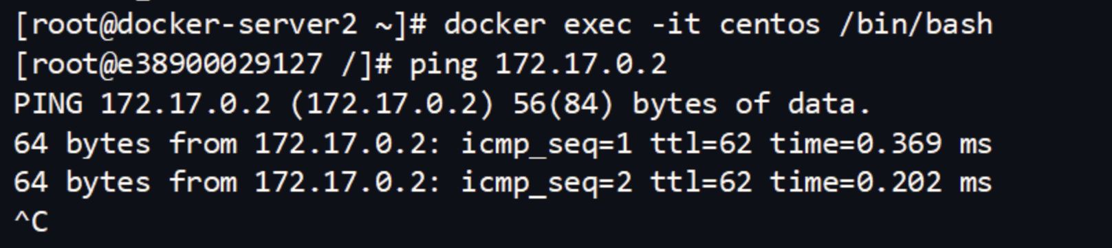 进入到docker-server2主机的centos容器中,ping docker-server1主机的centos容器,进行测试