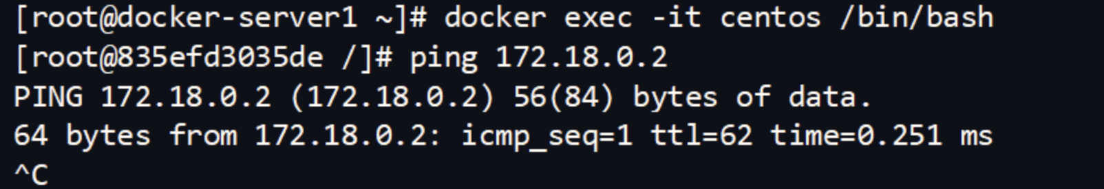 进入到docker-server1主机的centos容器中,ping docker-server2主机的centos容器,进行测试